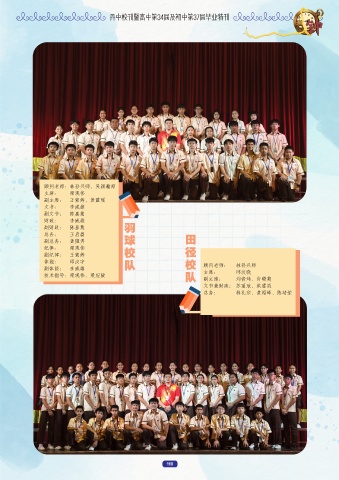 丹中校刊暨高中第34届及初中第37届毕业特刊 顾问老师: 林孙兴师、吴颖瀚师 主席: 梁观伟 副主席: 王紫婷、黄露瑶 文书: 李威雄 副文书: 陈嘉慧 财政: 李威雄 副财政: 陈嘉慧 羽 总务: 王启磊 副总务: 黄弫羿 球 田 纪律: 梁观伟 径 副纪律: 王紫婷 校 体能: 邱汶宇 队 校 副体能: 李威雄 顾问老师: 林孙兴师 队 副主席: 刘俊玮、许礎荑 技术指导: 梁观伟、梁宏骏 主席: 邱汶晓 文书兼财政: 苏丽欣、洪震类 总务: 林礼宗、黄绍峰、陈靖莹 110