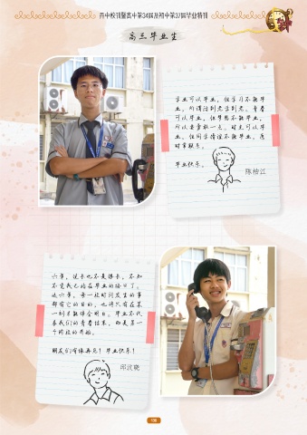 丹中校刊暨高中第34届及初中第37届毕业特刊 高三毕业生 学业可以毕业,但学习不能毕 业,所谓活到老学到老。青春 可以毕业,但梦想不能毕业, 所以要勇敢一点。时光可以毕 业,但同学情谊不能毕业,愿 时常联系。 毕业快乐。 陈柏江 六年,说长也不是很长,不知 不觉我已站在毕业的路口了。 这六年,每一段时间发生的事 都有它的目的,也许只有在某 一刻才能体会明白。毕业不代 表我们的青春结束,而是另一 个阶段的开始。 朋友们有缘再见!毕业快乐! 邱汶晓 136