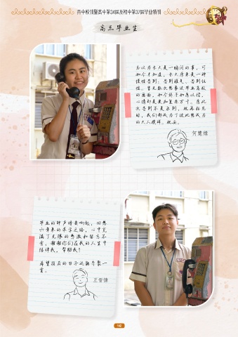 丹中校刊暨高中第34届及初中第37届毕业特刊 高三毕业生 总以为长大是一瞬间的事,可 如今才知道,长大原来是一种 慢性告别:告别稚气、告别任 性。曾无数次想象过毕业离校 的画面,如今终于如愿以偿, 心情却是更加复杂万千。愿此 次告别不是永别,祝再相见 时,我们都成为了彼此想成为 的大人模样。祝安。 何慧缘 毕业的钟声将要响起,回想 六年来的求学之路,心中充 满了无限的感激和留恋不 舍,谢谢你们在我的人生中 陪伴我,帮助我! 希望往后的日子还能齐聚一 堂。 王晋慷 142