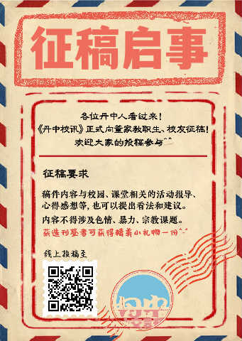 征稿启事 各位 丹 中 人 看 过 来 ! 各位丹中人看过来! 董 家 教 正 式 向 征 友 ! 稿 生 职 校 、 《丹中校讯》正式向董家教职生、校友征稿! 校 讯 》 《丹 中 参 ^ ^ 与 稿 欢迎大家的投稿参与^^ 欢迎 大 家 的 投 征稿要求 稿件内容与校园、课堂相关的活动报导、 心得感想等,也可以提出看法和建议。 内容不得涉及色情、暴力、宗教课题。 获选刊登者可获得精美小礼物一份^-^ 线上投稿至
